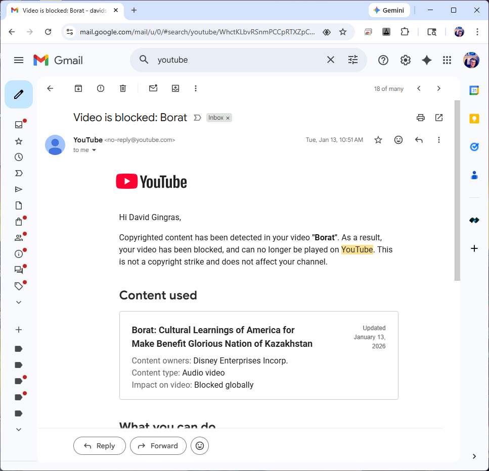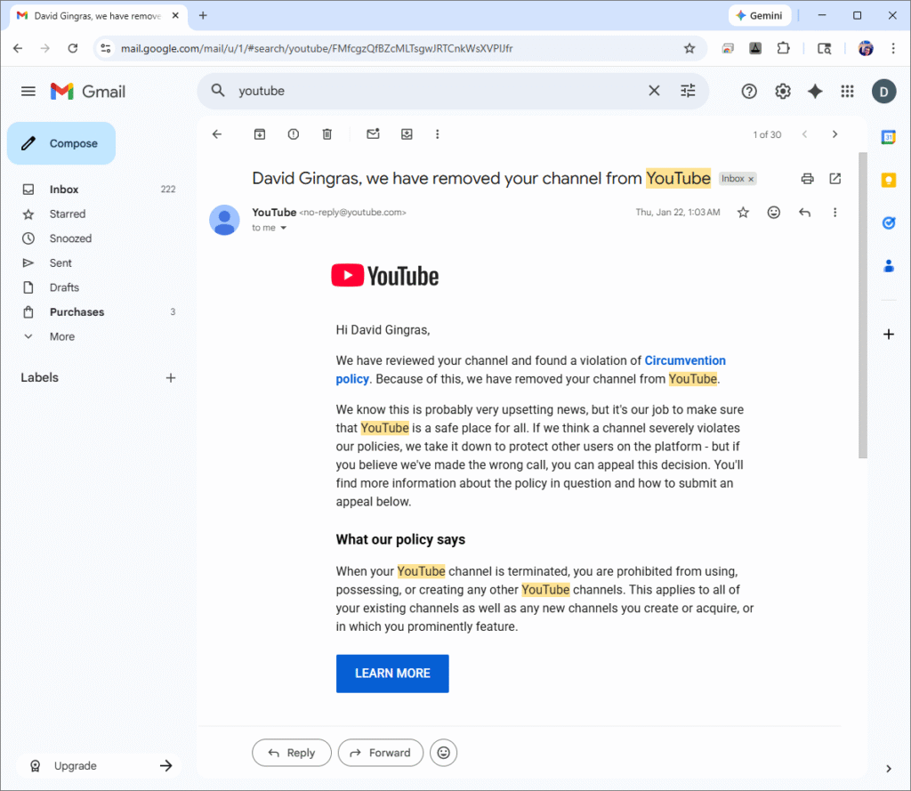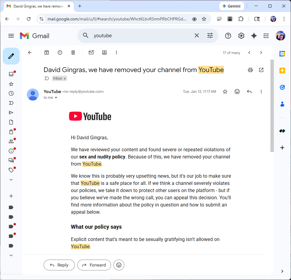 But then on January 22nd, I got another email from YouTube (sent to an alt Gmail I rarely use). That email said they removed the YouTube channel associated with that alt account, even though I never used it and (to my memory), it didn’t even have any content on it. I think it’s possible the channel may have had some old news clips from some case I worked on, but I hadn’t touched it in YEARS (like 10+ years).