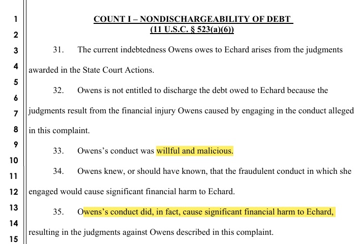 See paragraph 35? It claims Laura caused “significant financial harm to Echard.” It doesn’t explain precisely what that means, but it’s not hard to guess — it’s referring to the $200K in fees awarded to Clayton. That would be harm (although I would still argue it’s self-inflicted harm, but that’s a separate issue).