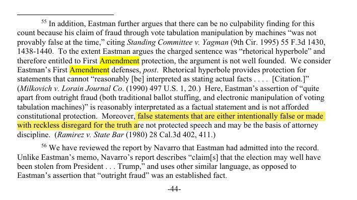 Notable is the fact Eastman argued some of his actions were protected by the First Amendment. That’s ballsy – the guy literally lied and tried to help a criminal steal the election through fraud. Free speech covers that, right?