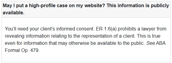 But that logic has no application to general information about a client’s case which has either been widely covered by the media OR which has otherwise become a public record (even if the information is not widely known). The biggest problem with the AZ bar’s hyper-restrictive reading of ER 1.6 is that it directly conflicts with controlling U.S. Supreme Court case law dealing with these exact issues.